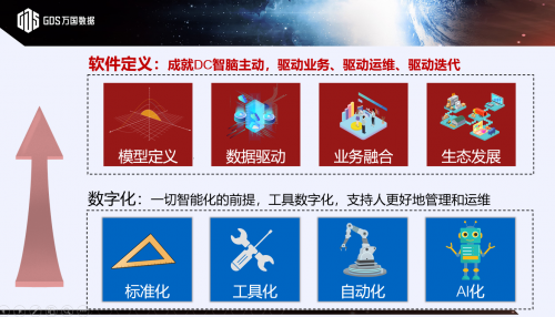 万国数据提出的“软件定义数据中心”理念拥有一套完整管理模式和支撑体系,通过定义并建立不同的功能模型,将人的经验和大数据分析结果融入其中,并确保数据来源的唯一性,从而在横向实现设计、建设、接维、运营、服务全生命周期业务的数据联通,打破各环节间的壁垒,实现业务有机融合,最终达到全条线、全周期、全维度,纵横贯穿的融合质变,真正利用软件来驱动人员、运营和业务,并以此方式连接整个产业链,形成更加高效、优质的数据中心交付及服务生态。
