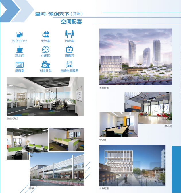 星河·领创天下(郑州)位于郑州市核心区中原区二砂文化创意园,配套齐全、交通便利。空间面积约2500平米,为企业打造精品空间配套服务,提供全产业链要素对接,全维度助力企业加速成长,提供私密及共享办公空间、创新直播空间,优质项目还有机会获得星河产业资源及资本服务。顺应创新经济与消费升级发展趋势,以“保护”、“融合”、“创新”的塑造理念,未来将重点关注文化创新、科技服务等行业领域。