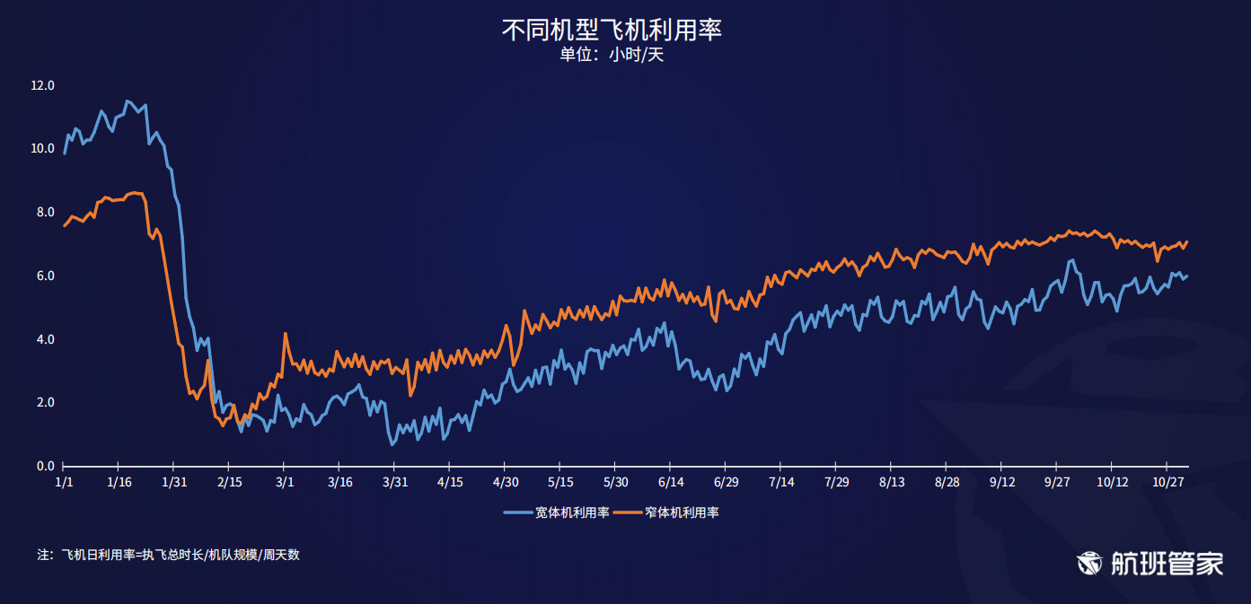 飞机利用率总体上行,但窄体机利用率均高于宽体机。上周10月27日窄体机、宽体机利用率最低。
