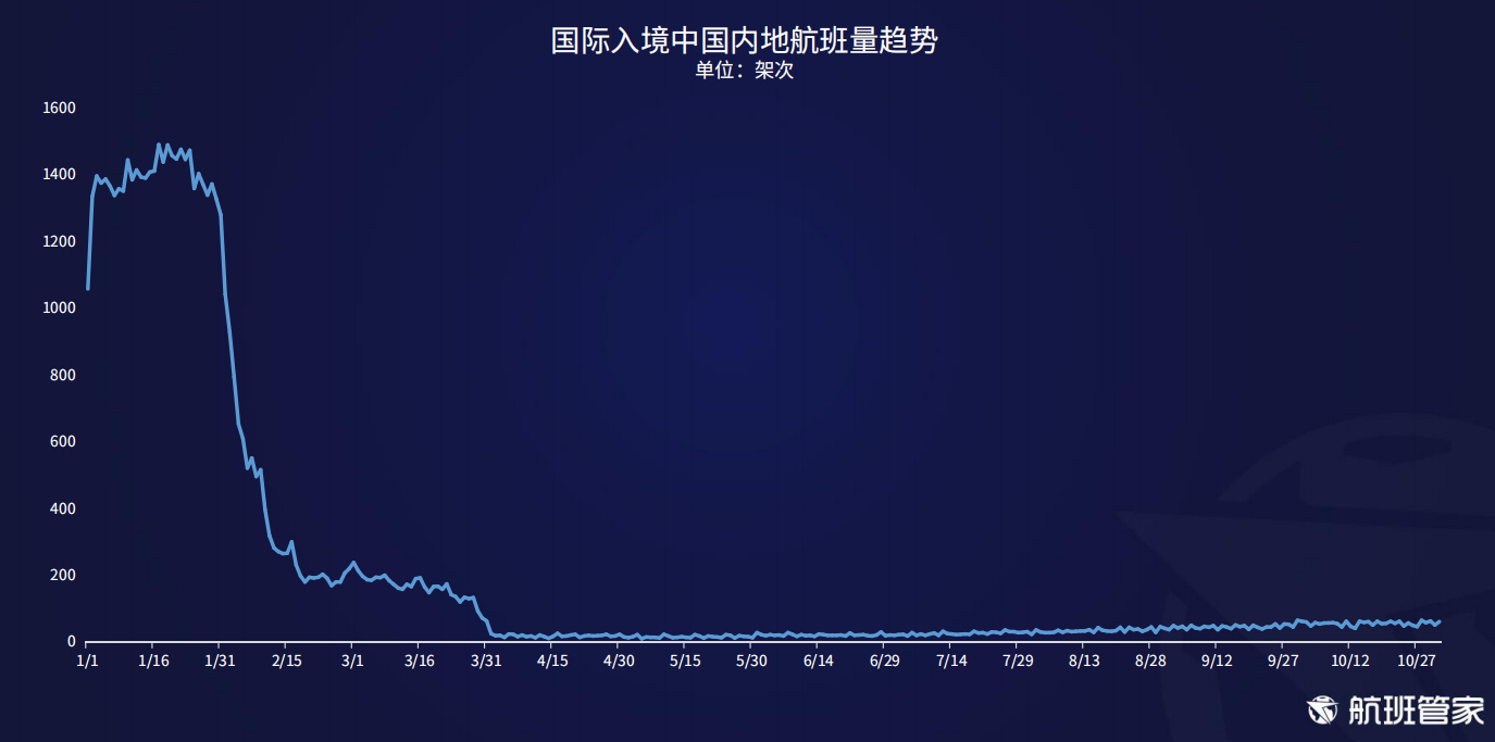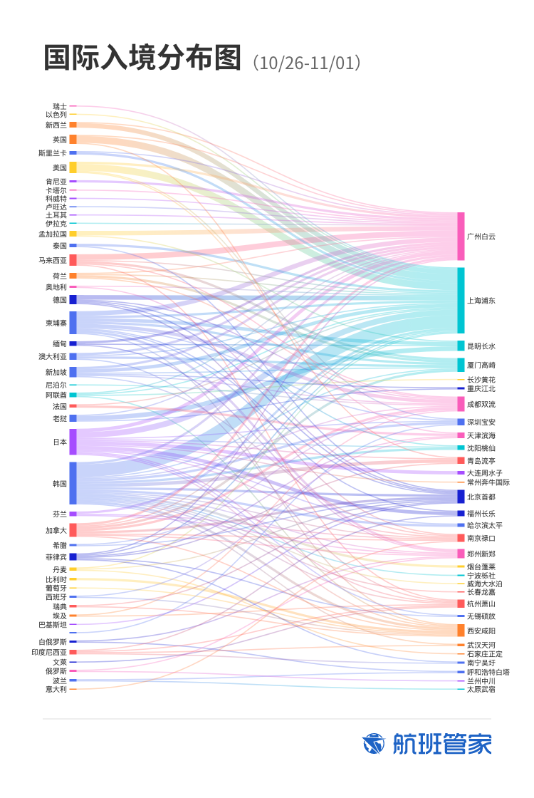 上周国际入境航班总量401架次,日均低于70架次。
