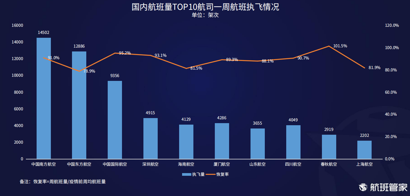 上周南方航空一周执飞航班量最高,达到14502架次;国内航班量前10名航司中,春秋航空恢复率最高,达到101.5%。