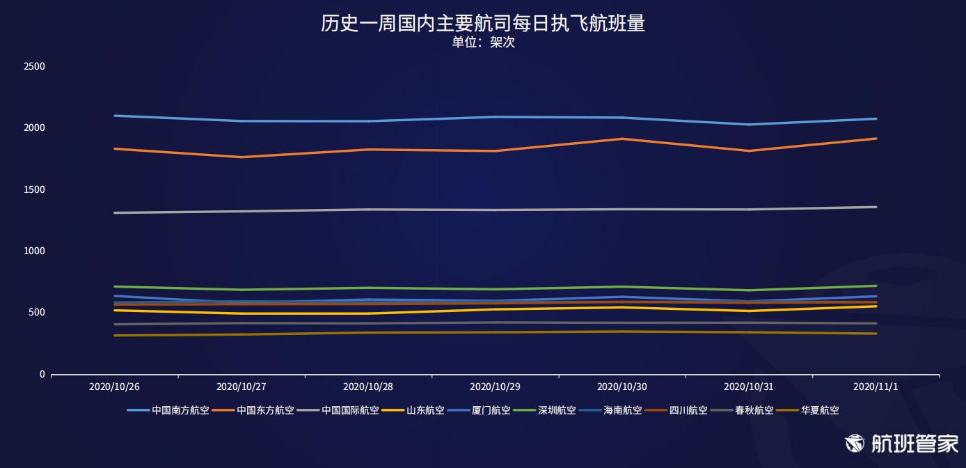 上周南方航空、东方航空每日执飞航班量均在1700架次以上,显著高于其他航司。