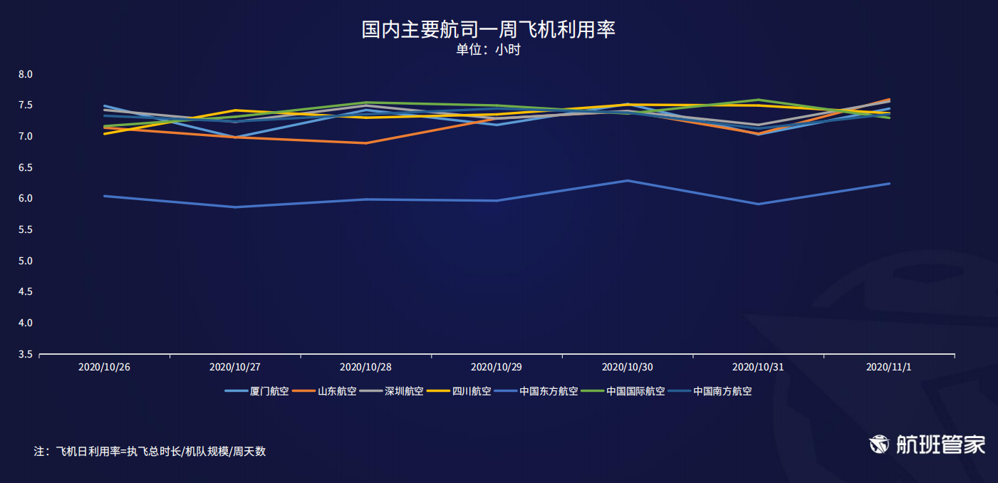 中国国际航空是上周飞机日利用率最高的航司,日均飞机利用率达到7.39小时,其次是深圳航空达到7.37小时。