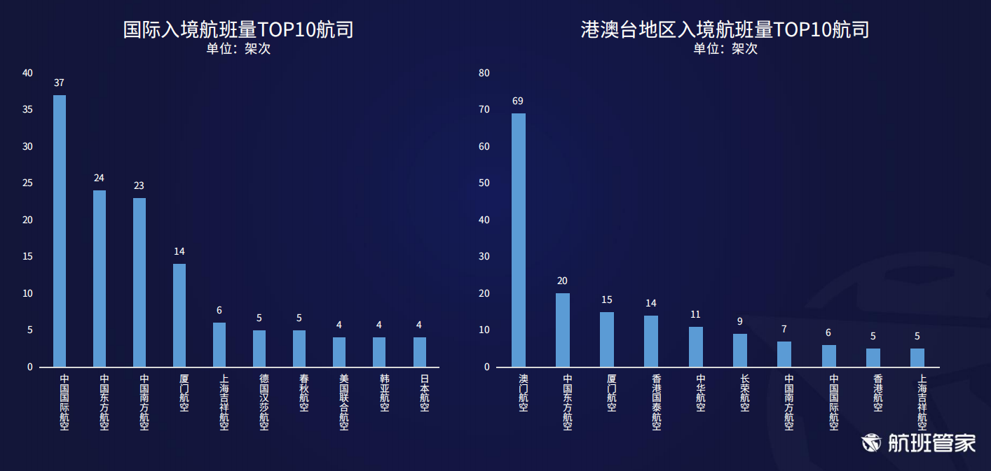 国航、南航、东航主要运营国际入境航班,澳门航空是港澳台地区入境航班量最多的航司。