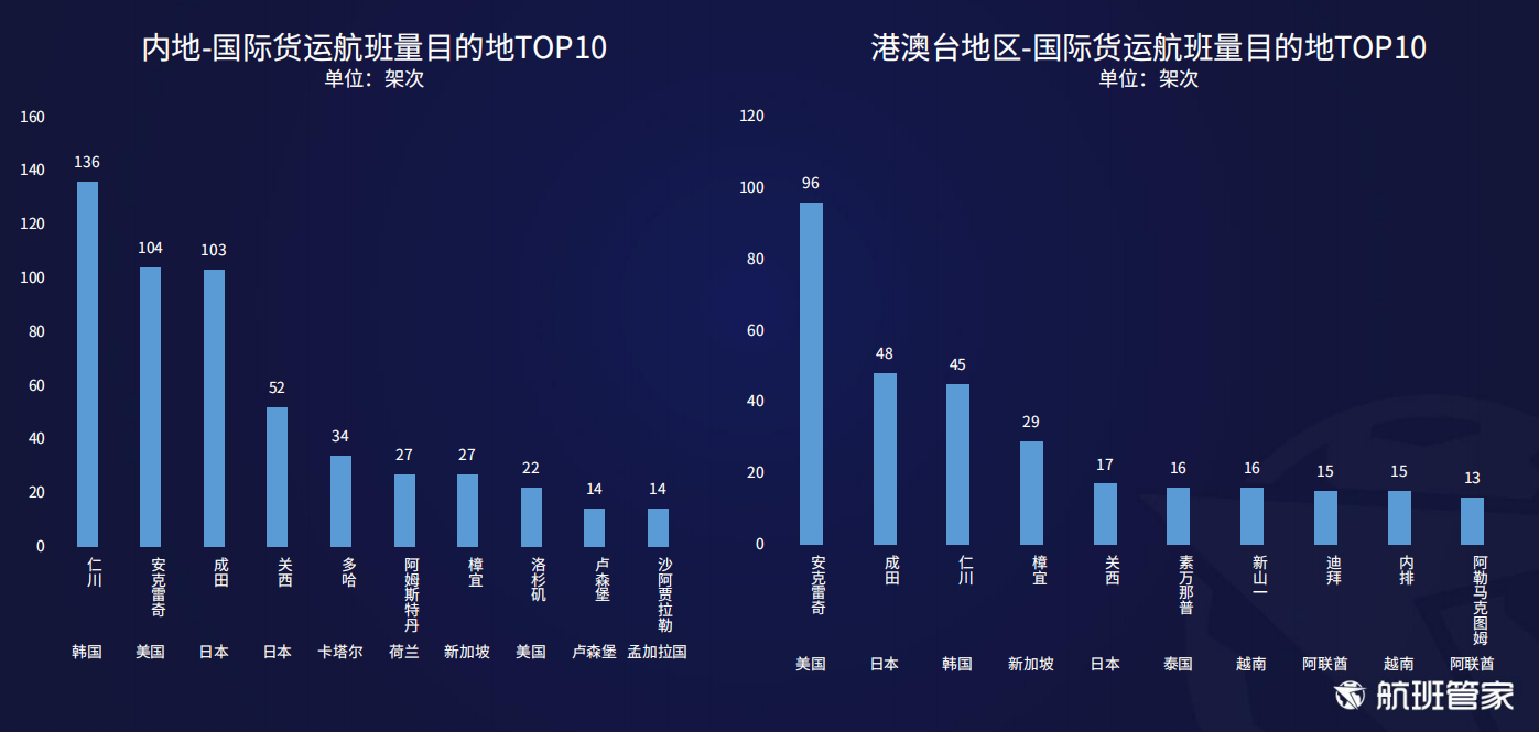 韩国、美国、日本为内地货运航班量前三位的目的地,美国是港澳台地区货运航班量最多的目的地。