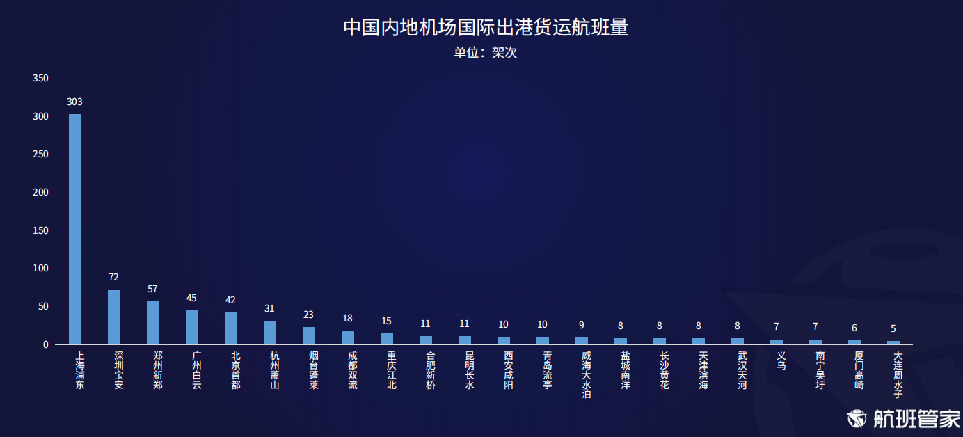 国际出港货运航班量前3位内地机场为上海浦东机场、深圳宝安机场、郑州新郑机场,其中上海浦东机场的出港货运航班量是303架次,远高于深圳宝安和郑州新郑。