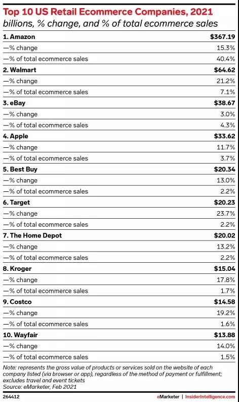 据eMarketer研究的数据显示,亚马逊在美国电商销售中所占的份额将从2020年的39.8%增长到2021年的40.4%,增幅为0.6个百分点,这一增速将超过今年任何一家竞争对手。