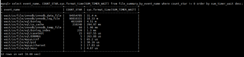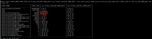 分析:再次观察系统资源情况,CPU利用率上升到50%左右,IO和网络没有压力,怀疑关键瓶颈是数据库内部的资源等待。检查MySQL当前等待事件: