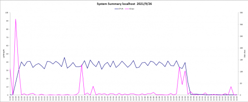 分析:观察系统资源使用情况,发现有大量磁盘IO事件。当前磁盘读写已成为制约系统性能的首要瓶颈,考虑通过增大共享内存的方式尽量将数据放入内存中进行操作以减小磁盘IO压力。