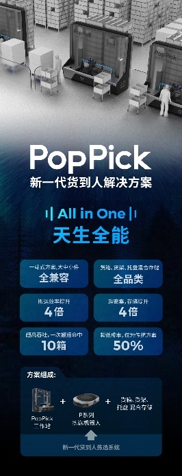 新一代货到人解决方案PopPick,主要由PopPick工作站+P系列拣选机器人+货箱/货架/托盘混合存储系统组成,兼顾超高兼容、超高存储、超高吞吐和超高人效和投资回报四大优势