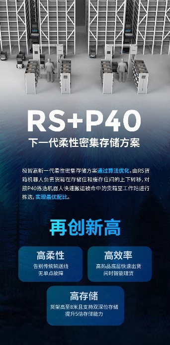 RoboShuttle+P40柔性密集存储方案作为极智嘉新一代货箱到人方案,兼顾高柔性、高效率和高存储等多重优势。RS8货箱机器人负责货箱在存储位和缓存位间的上下转移,对接P40机器人快速搬运被命中货箱至工作站进行拣选,两种机器人通过算法优化,实现最优配比。