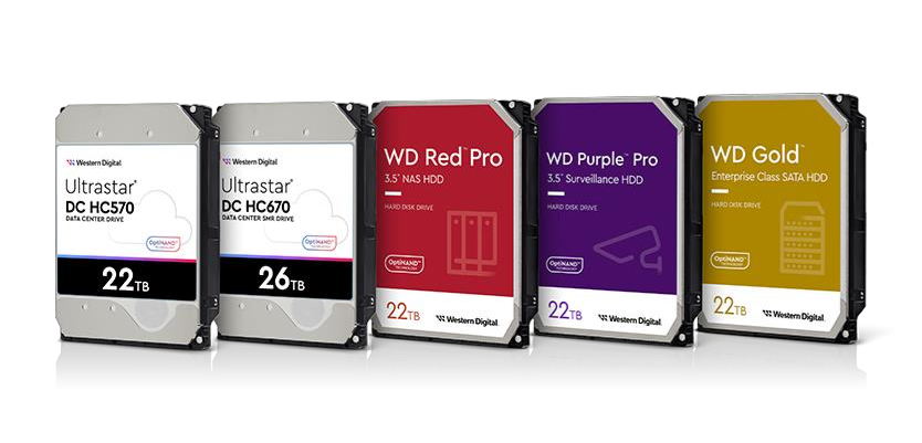 从左到右依次为:西部数据 22TB Ultrastar DC HC570 HDD、26TB Ultrastar DC HC670 UltraSMR HDD、WD Red Pro 22TB HDD、WD Purple Pro 22TB HDD、WD Gold 22TB HDD