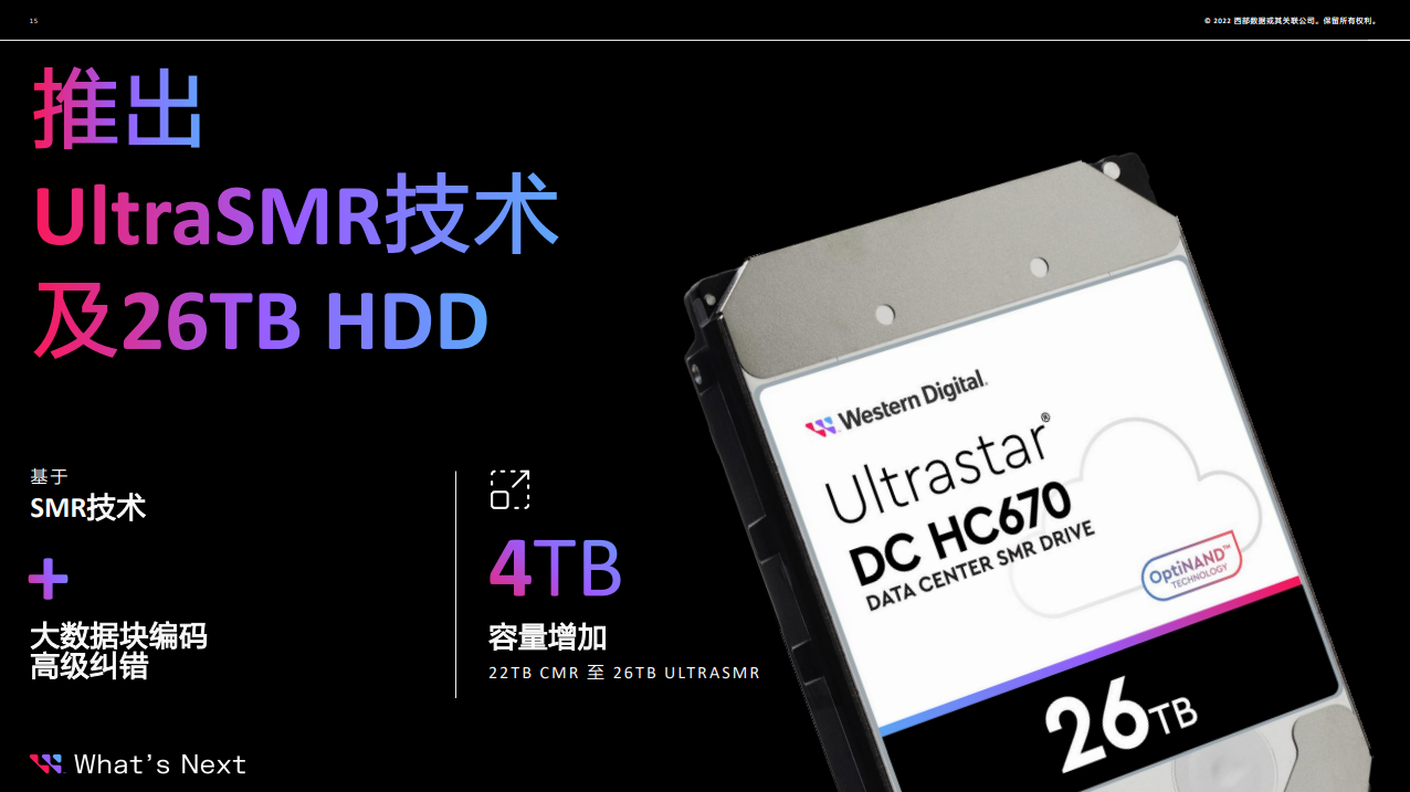 其中,22TBUltrastar DC HC570 HDD利用西部数据的OptiNAND技术,将HDD的存储容量、性能和数据弹性提升至新的高度,在成熟的单碟2.2TB的氦气封装技术上实现了10碟更高的面密度。
