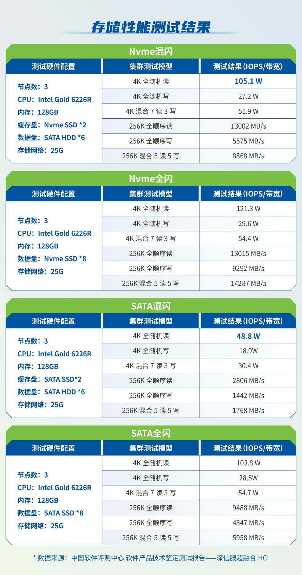测试报告显示,在三节点Nvme混闪的测试环境中,集群4K随机读模型超过105万IOPS!在三节点SATA混闪的测试环境中,集群4K随机读模型超过48.8万IOPS。