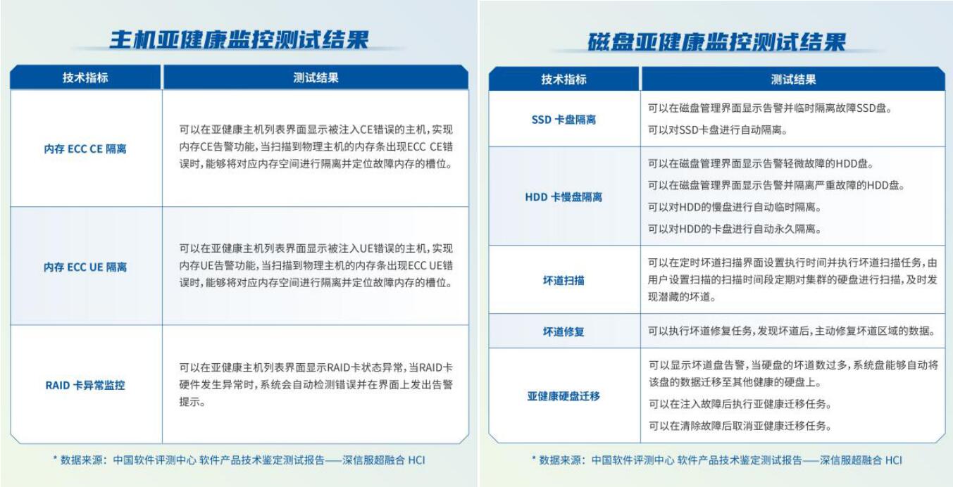 除了常用的多副本、热迁移、HA等功能之外,本次测试还包含主机亚健康监控、内存故障检测、磁盘亚健康监控、RAID卡异常监控等软件定义可靠性功能,信服云超融合打造的软件定义可靠性解决方案,可有效降低服务器亚健康问题为业务带来的风险。