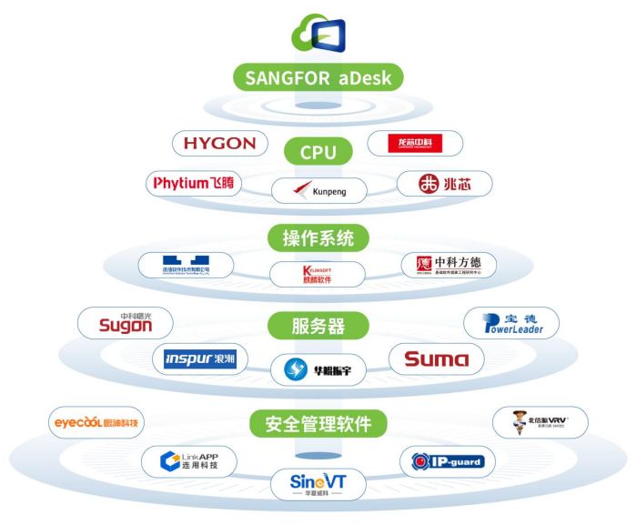 信创桌面云早已和国内主流CPU、操作系统、服务器设备、安全管理软件等完成兼容认证,包含鲲鹏、飞腾、海光、龙芯、麒麟、中科可控、浪潮等,支持以信创PC或信创桌面云瘦终端作为用户的前端接入设备,与生态合作伙伴优势互补,实现从操作系统到软件、从终端到服务端的国产化改造效果,为用户提供兼容更广、层次更深的国产化、数字化办公方案。