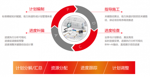 应用场景三:项目进度管理。传统管控模式由于缺乏有效的进度管理工具、进度执行与编制脱节、进度上下游各个专业之间协调不力等问题,造成了项目的延期。用友BIP项目云进度管理从计划的分解汇总、资源的分配、进度的跟踪、进度的调整与纠偏的PDCA环节解决这问题。