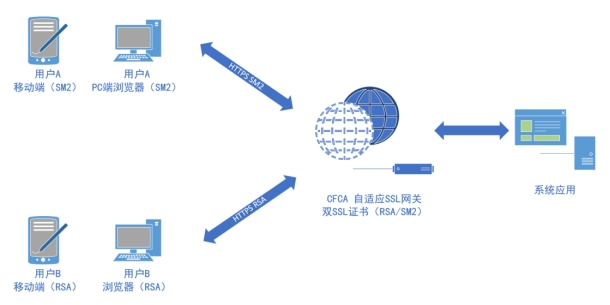 基于CFCA自适应SSL网关,实现根据用户采用不同的浏览器自适应选择加密套件和SSL证书。如果用户使用支持国密协议的浏览器访问,则优先用国密SSL证书建立国密加密通道;如果用户使用不支持国密协议的浏览器访问,则用国际算法SSL证书进行加密通信。