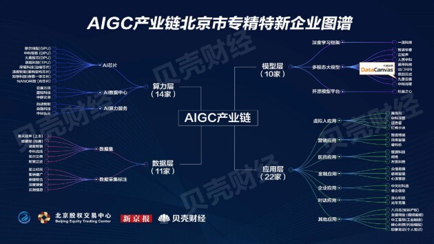 《图谱》显示,在AIGC产业链领域,北京市走在全国前列,在算力、数据、场景、投资、人才等方面优势显著,并有57家优质专精特新企业处在重要产业节点,包括算力层14家、数据层11家、模型层10家、应用层22家。其中,模型层分为深度学习框架、开源模型平台、多模态大模型三大类,九章云极DataCanvas公司以突破性的AI技术成果和高度的产品商业化能力入选多模态大模型代表企业。