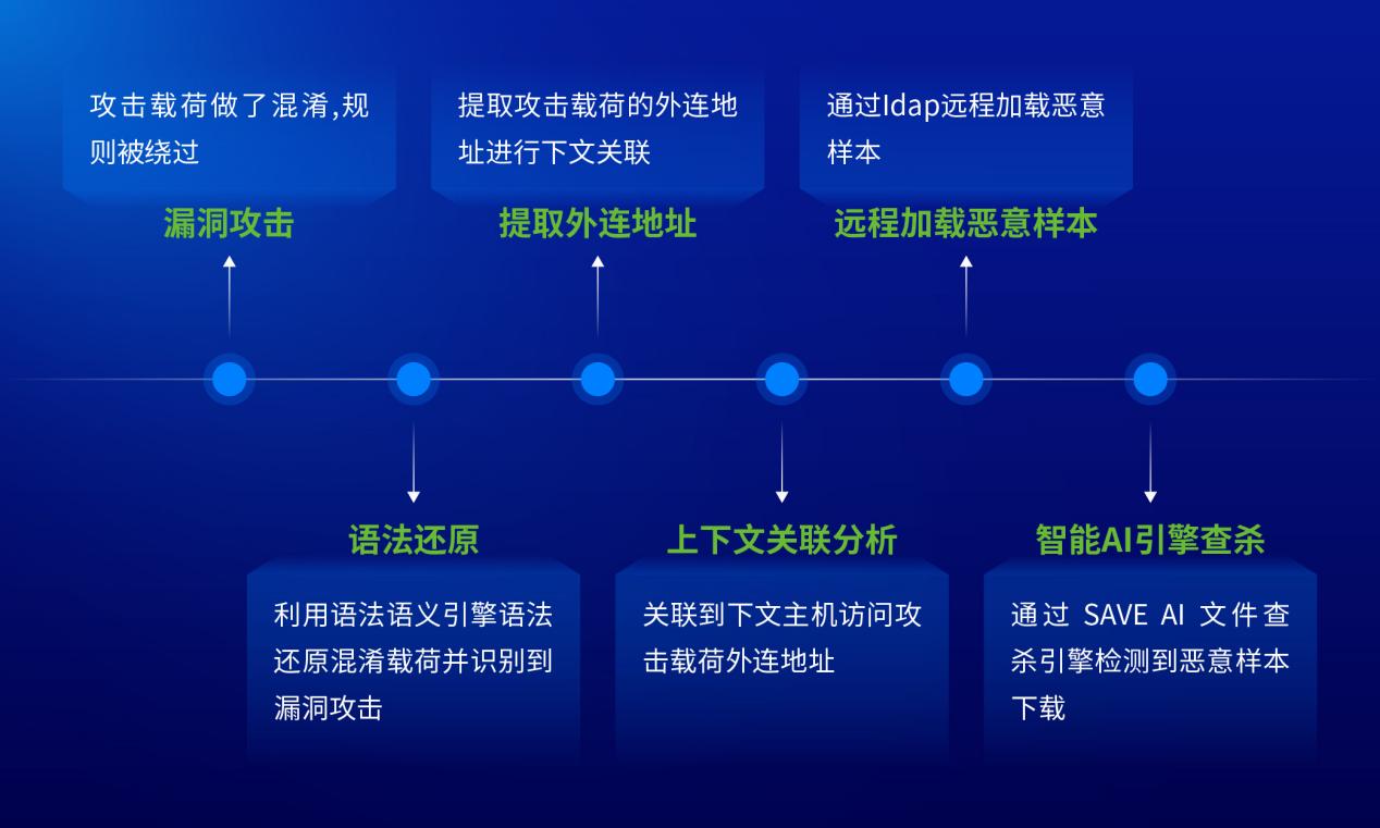 比如针对Log4j漏洞利用的攻击,XDR可通过“漏洞攻击-语法还原-提取外联地址-上下文关联分析-远程加载恶意样板-智能AI引擎查杀”进行关联与攻击信息举证。