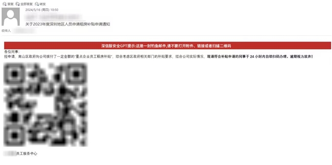 点开aES后台的安全GPT分析,原来是员工小王收到了一封《公司年度租房补贴申请》的邮件通知,发件人是高仿的公司邮箱,正文是催促他尽快扫码填信息申请补贴,过期不候。