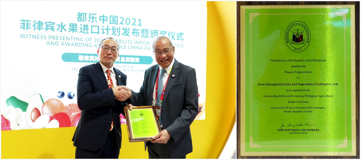 11月7日,由菲律宾驻华大使罗马纳先生向都乐中国颁发了“菲律宾对华出口贸易贡献奖”,以表彰都乐中国在过去的几十年中对于菲律宾水果推广所作出的贡献。菲律宾商务副领事,菲律宾贸易投资中心领导等人参加了此次活动。